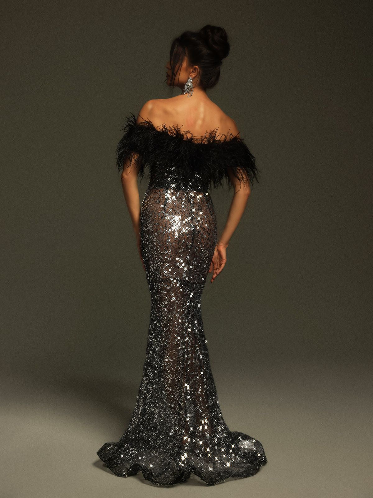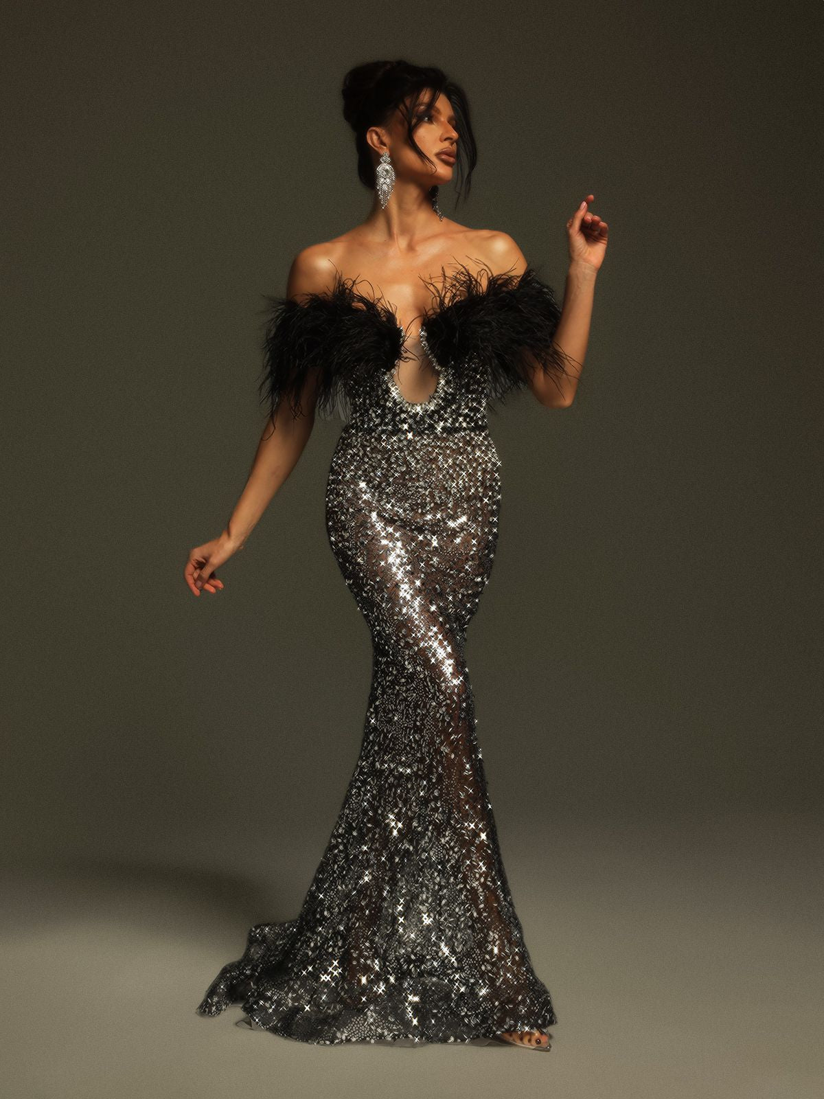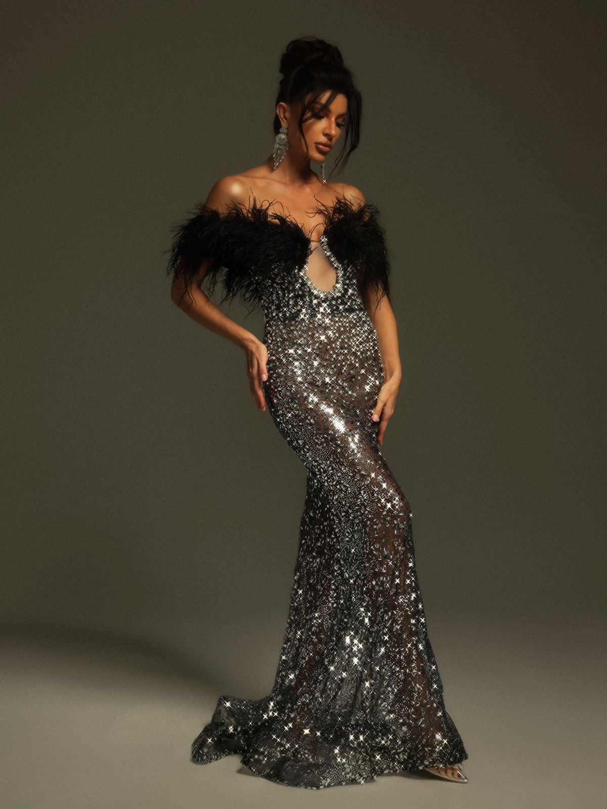 Tayne Off Shoulder Feather Rhinestone Maxi Dress