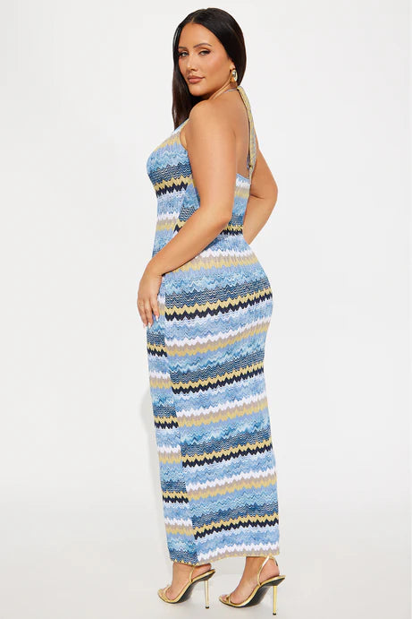 This vibrant halter maxi dress is designed to flatter your curves with its body-hugging silhouette and playful wave pattern. 🌊 The chic keyhole detail at the front adds a touch of allure, while the soft, stretchy fabric ensures comfort all day or night. Perfect for summer parties, beach vacations, or evening cocktails, it combines elegance with effortless style. Pair it with heels and bold accessories for a glamorous look, or keep it casual with flats for daytime wear.