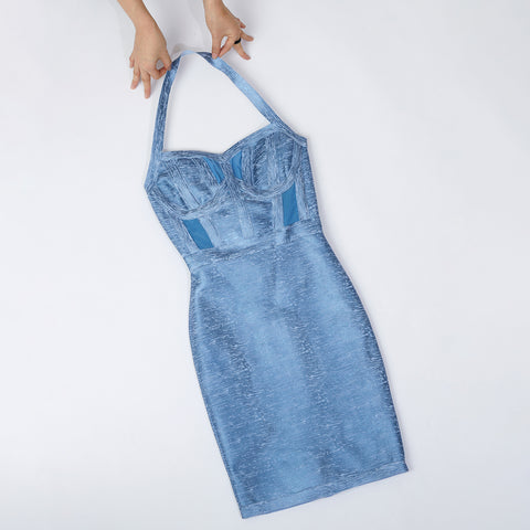 Crafted from our signature curve creating bandage fabric but with a wet look finish, Charlie Halterneck Bandage Dress In Blue is the new perfect LBD. It features a softly cupped bustling, flattering halter strap, clever paneling to create an hourglass silhouette, and a knee length cut to balance the look. We love this teamed with black pumps for that monochrome look.