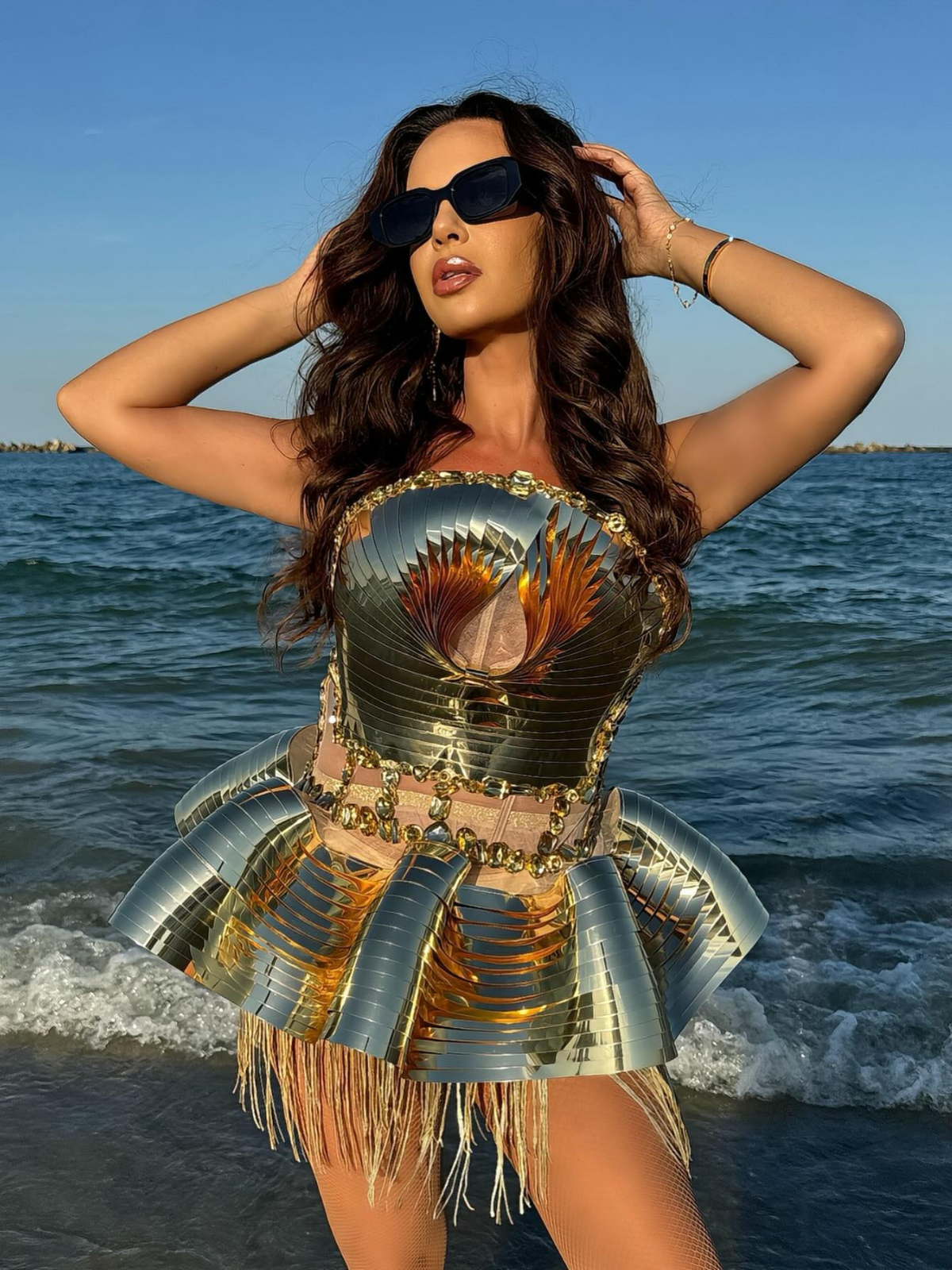 The Jahdiel Crystal Fringe Metallic Skirt Set In Gold delivers a glamorous, memorable look for any special event. Its strapless design with an eye-catching crystal fringe skirt is designed to make a statement. Its all-over design is embellished with intricate crystals that shimmer and glimmer with every movement, making it perfect for special occasions.