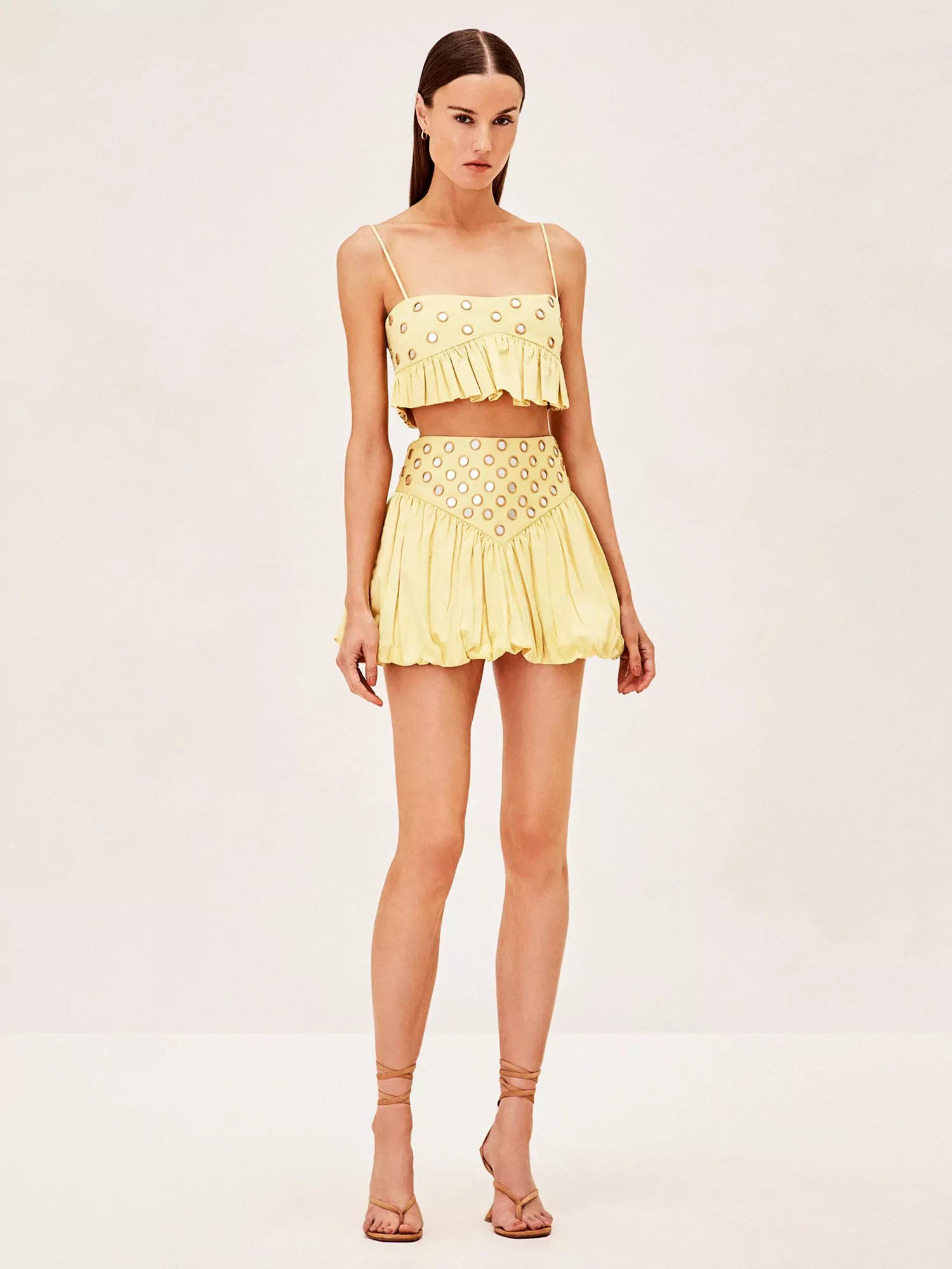Infuse your wardrobe with playful elegance through the Luminous Allure Mirror Skirt Set. This charming ensemble features a skirt embellished with shimmering mirror appliqués, designed to catch the light and captivate attention. The high-waisted design and fluid ruched details enhance its sophisticated appeal. Paired perfectly with the matching top, this set creates a cohesive and eye-catching outfit that exudes charm and style.