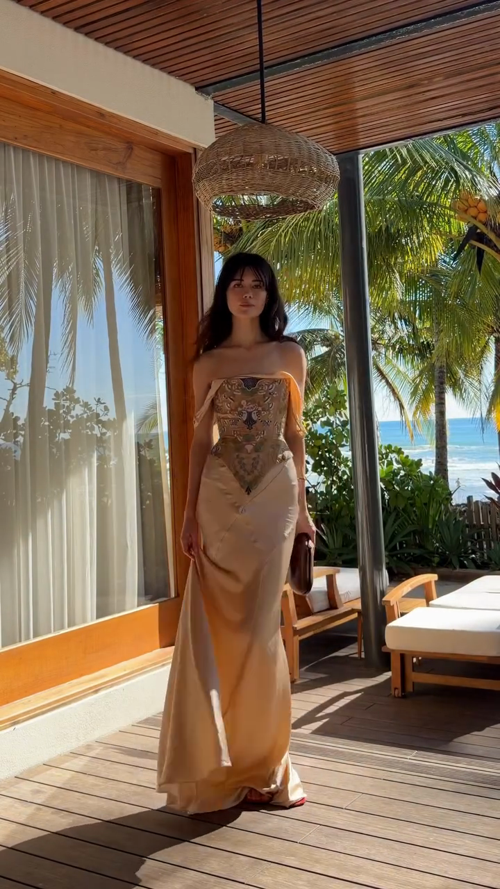 ✅ Luxurious champagne-colored satin fabric with a soft sheen, creating a sophisticated and shimmering base. ✅ Off-the-shoulder neckline paired with a hand-embroidered corset accentuates the figure. ✅ Floor-length fishtail skirt exudes elegant charm. ✅ Perfect for formal dinners, grand parties, and other special occasions.