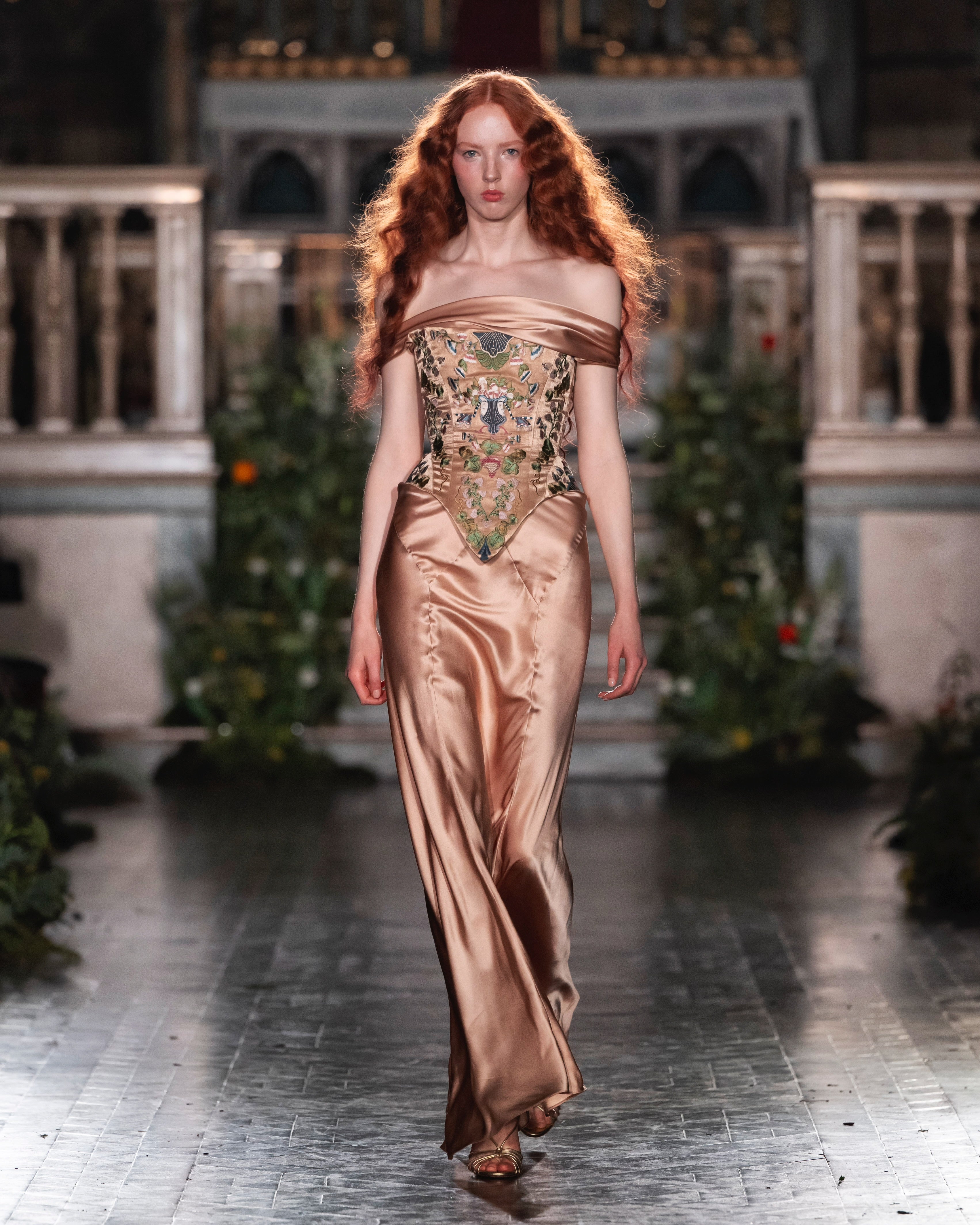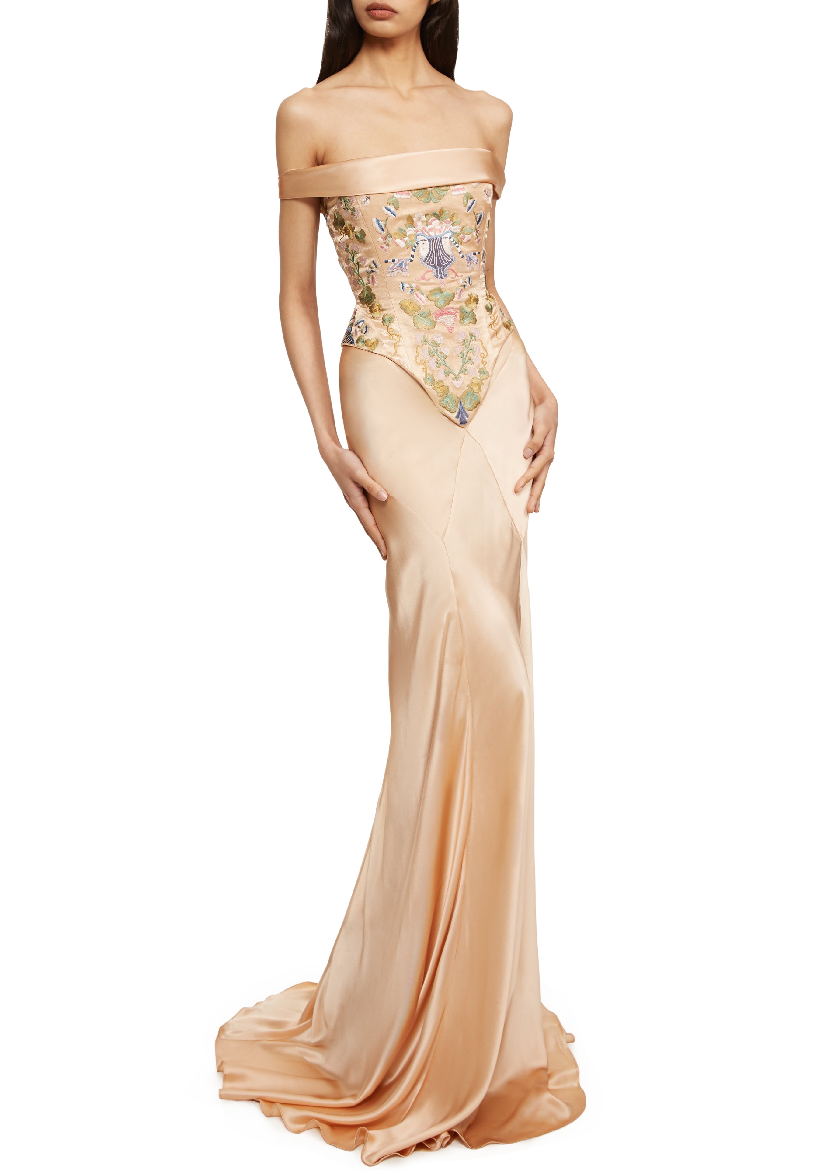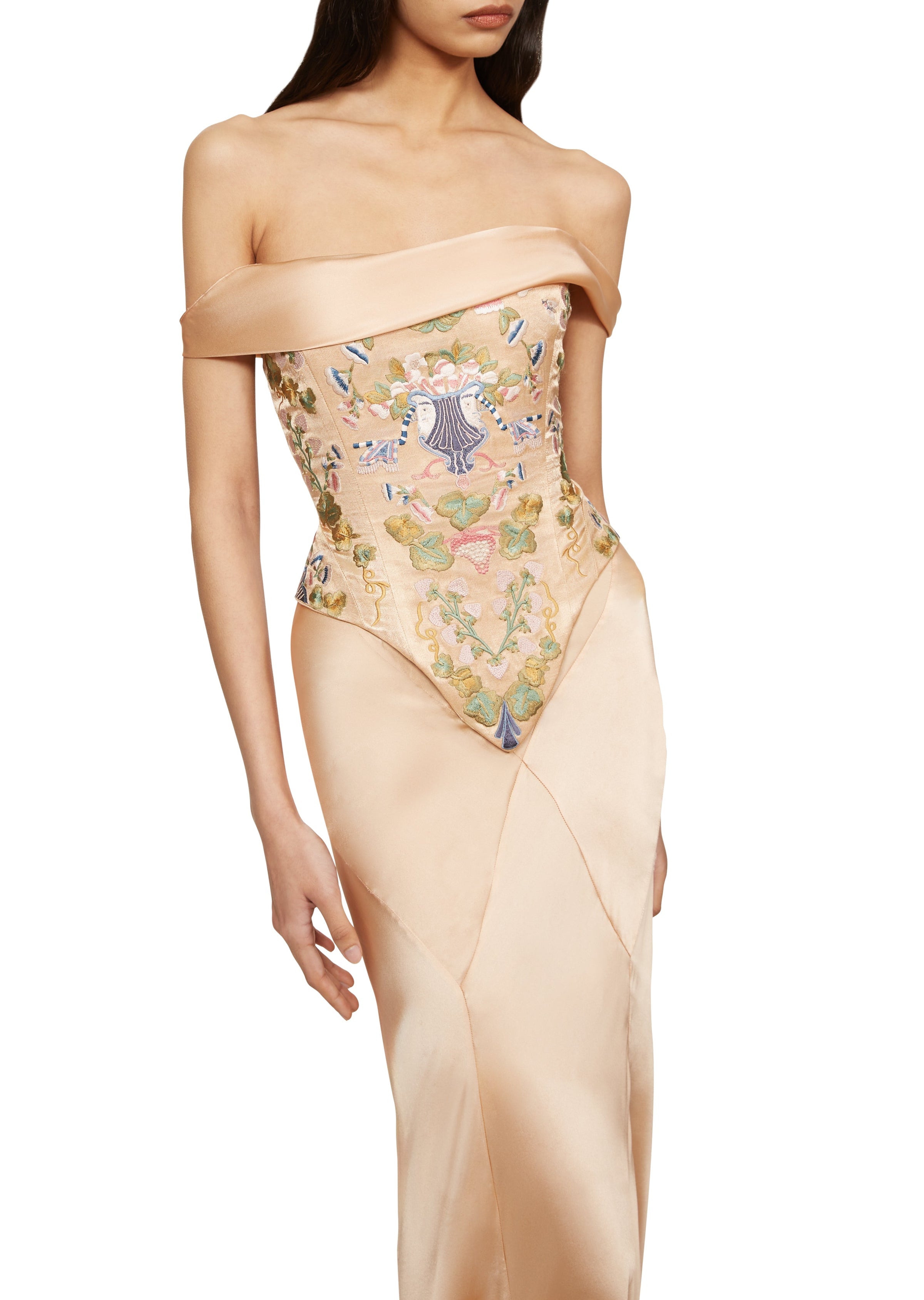 Off-the-shoulder embroidered top and champagne-colored satin dress set