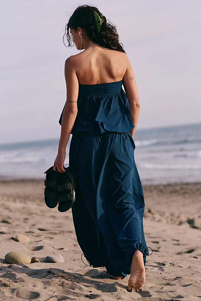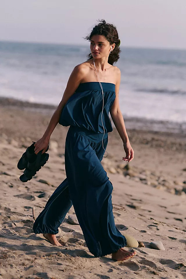 This set features a strapless top with a gathered, flowy design that sits comfortably on the shoulders. The matching wide - leg pants have an elasticized waist for a relaxed fit and elasticized cuffs that give them a balloon - like silhouette.