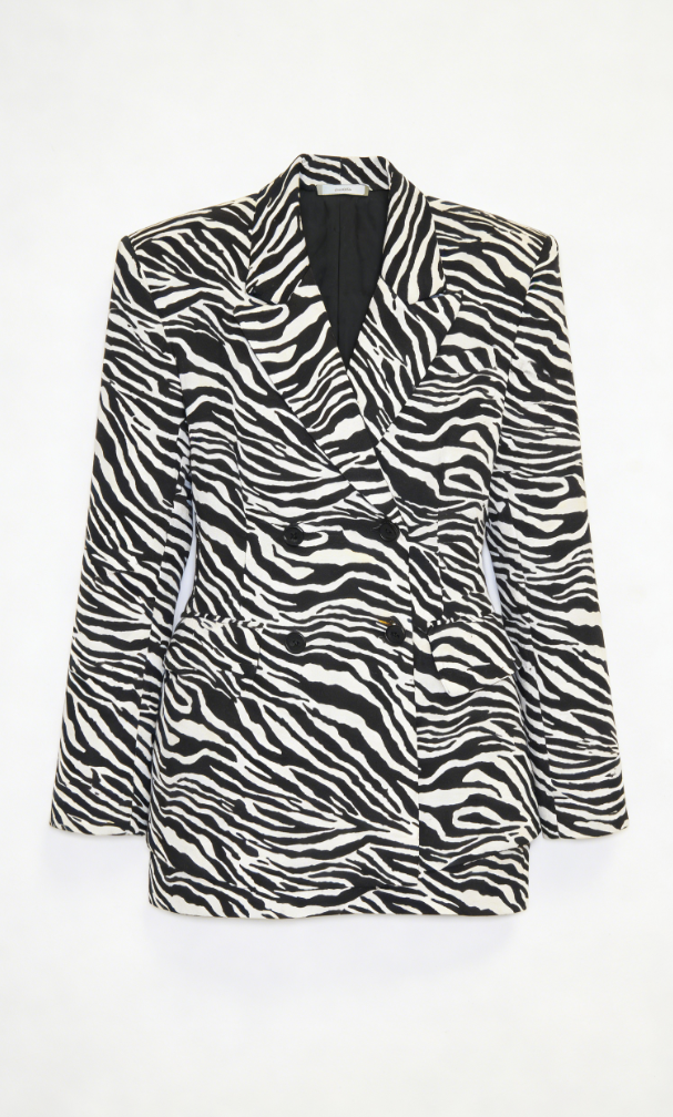 This oversized zebra-print blazer paired with a mini skirt elevates the overall style and charm with its bold pattern and effortless modernity.